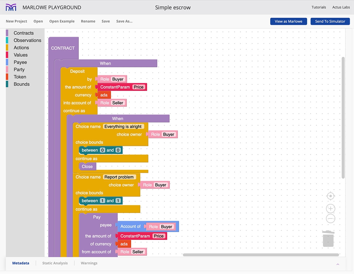 Marlowe Playground là một trình mô phỏng và xây dựng hợp đồng thông minh plug-and-play rất dễ sử dụng, trực quan và mô-đun. Xây dựng, mô phỏng và phân tích các hợp đồng của Marlowe trong 4 phút đến Sân chơi Marlowe này.